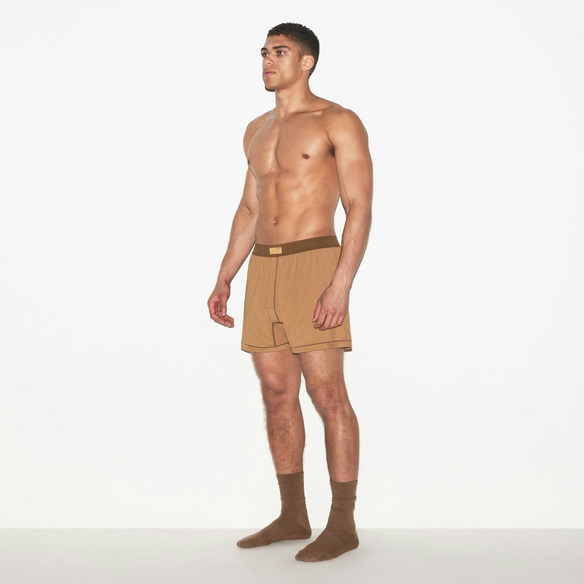 Not your average knit boxer. Engineered with our soft, breathable cotton with built-in recovery, this knit boxer brings you the best in comfort, now in a knit boxer 3-pack. Features a functional fly opening with hidden button and SKIMS logo at the soft waistband. Fits true to size.