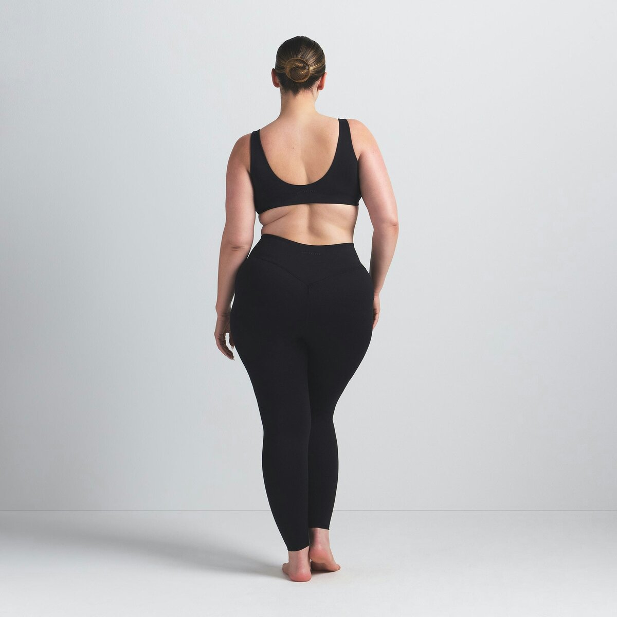 - High-waisted, Thick double layered waistband, Side dart detail, V-shape seams to accentuate butt shape, Silicone matte logo at center back, 100% Cotton gusset, Fits tight to body, 7/8 length