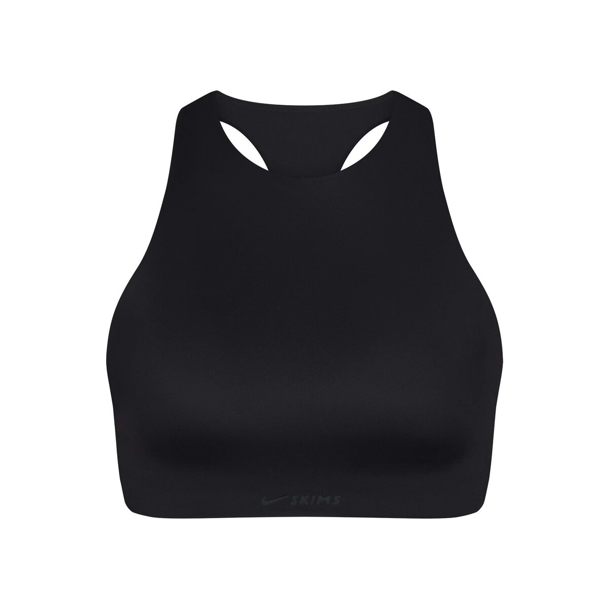- High neck bra, Built in soft lightly molded pads that provide coverage, Silicone matte logo at center front underband, Cut out detail at lower back, Hook and eye closure, Lined in power mesh and internal bonded panels for additional support, Fits tight to body, Best for high impact
