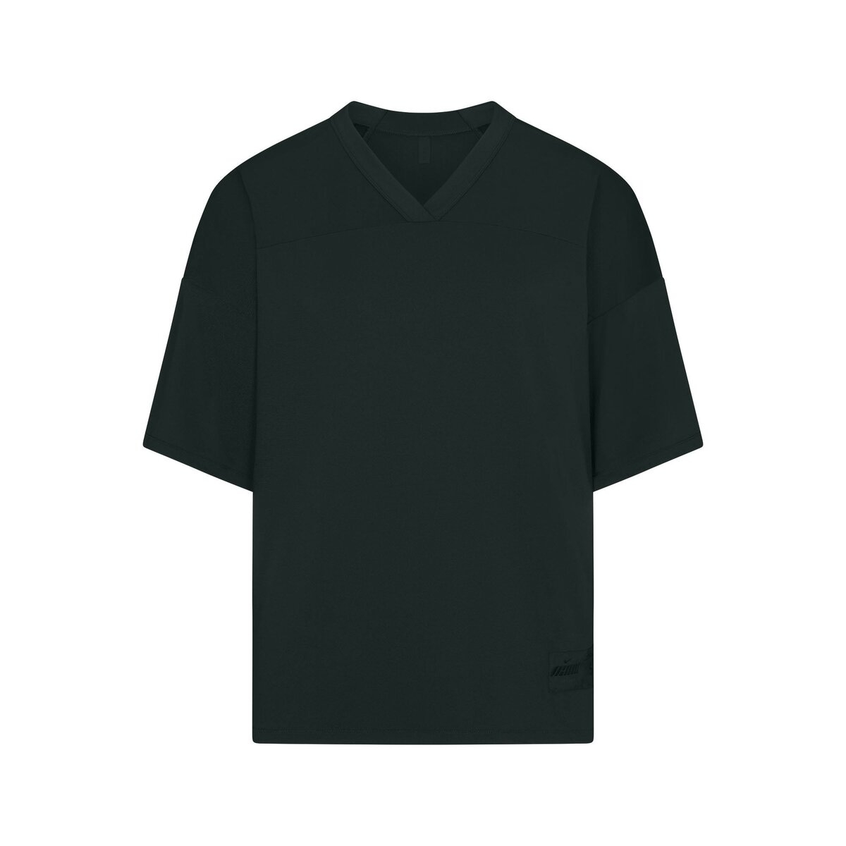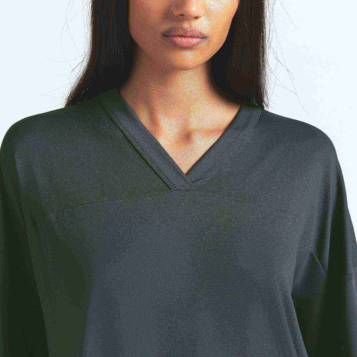 - V-neck, Raglan short sleeves, Front side and back seam details, Woven logo patch on wearers left, Oversized fit