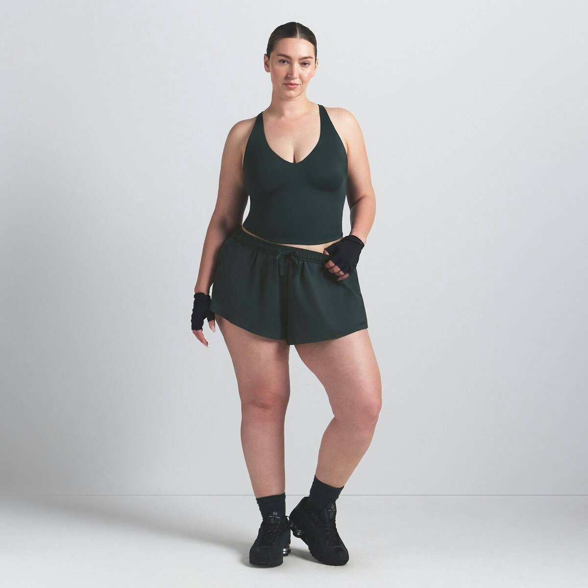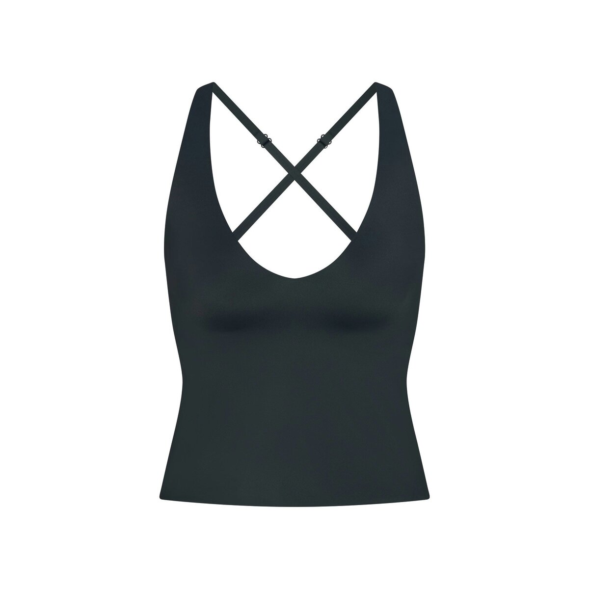 - Plunge v-neck, Built in soft lightly molded pads that provide coverage, Racerback design, Adustable straps, Silicone matte logo at center back, Fits tight to body