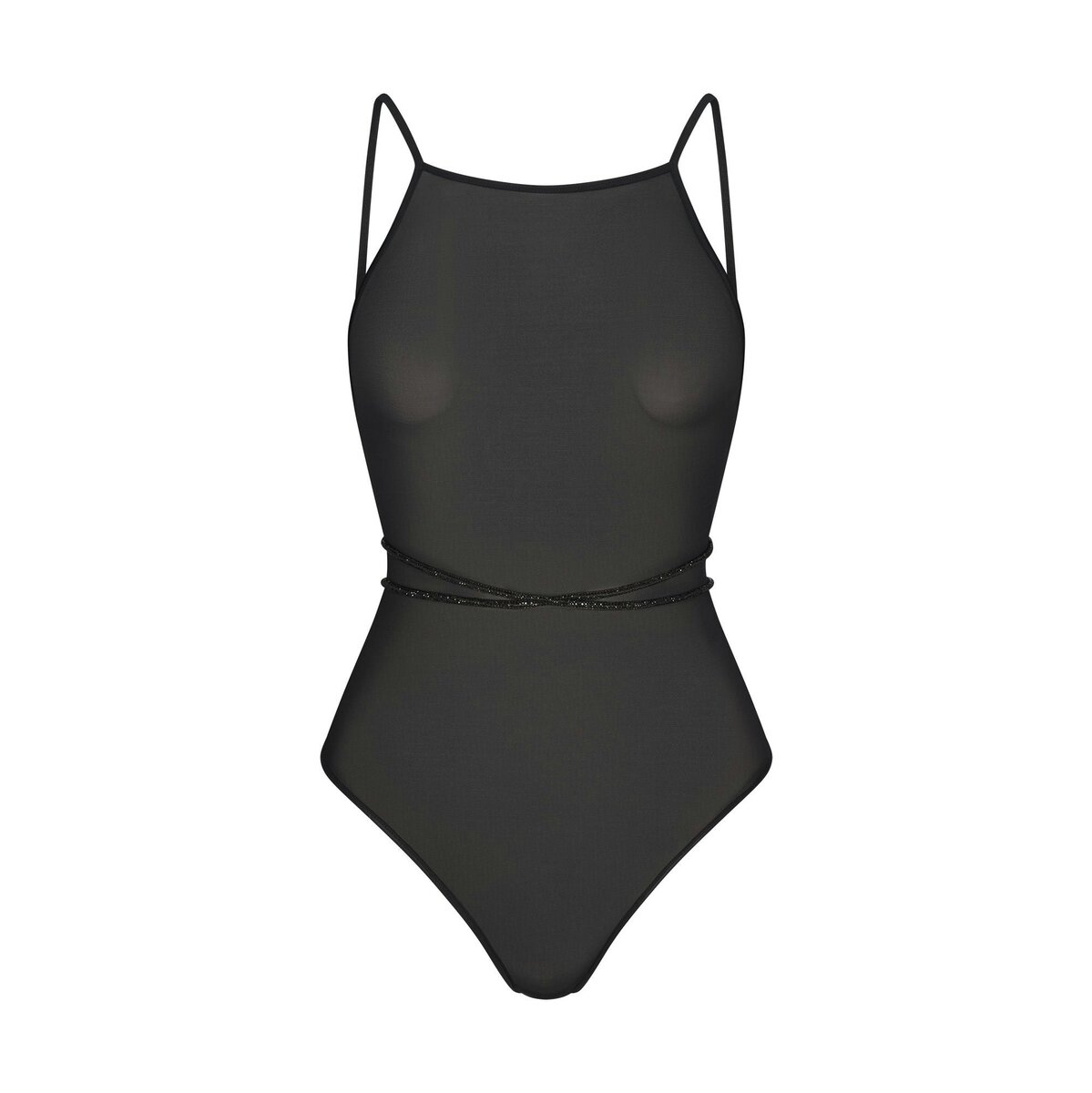 All eyes on this bodysuit. This sheer knit thong style features a high neckline, adjustable straps, and a daring open back with rhinestone ties at the waist. Complete with a 100% cotton gusset.