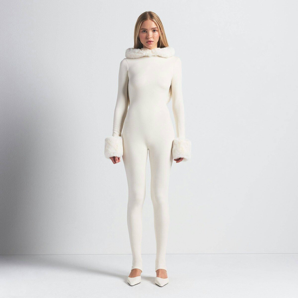 • Hooded catsuit, Long sleeves, Open back with satin bow detail, Faux fur trims at hood, Sleeves, And open back, Fits tight to body