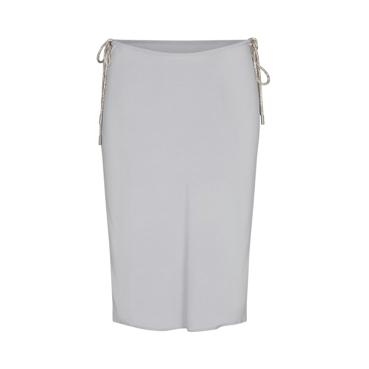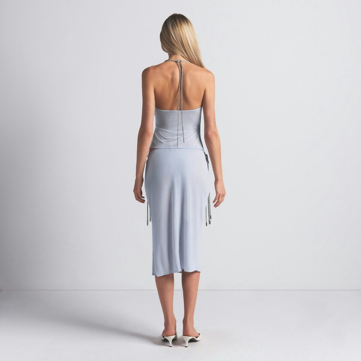 Low rise, high shine. This midi skirt sits at the hips and features side keyhole cutouts with rhinestone cord ties. Designed in a sheer knit fabric with a relaxed fit, it’s perfect for pairing with the matching bralette or cami for a full-on festive look.