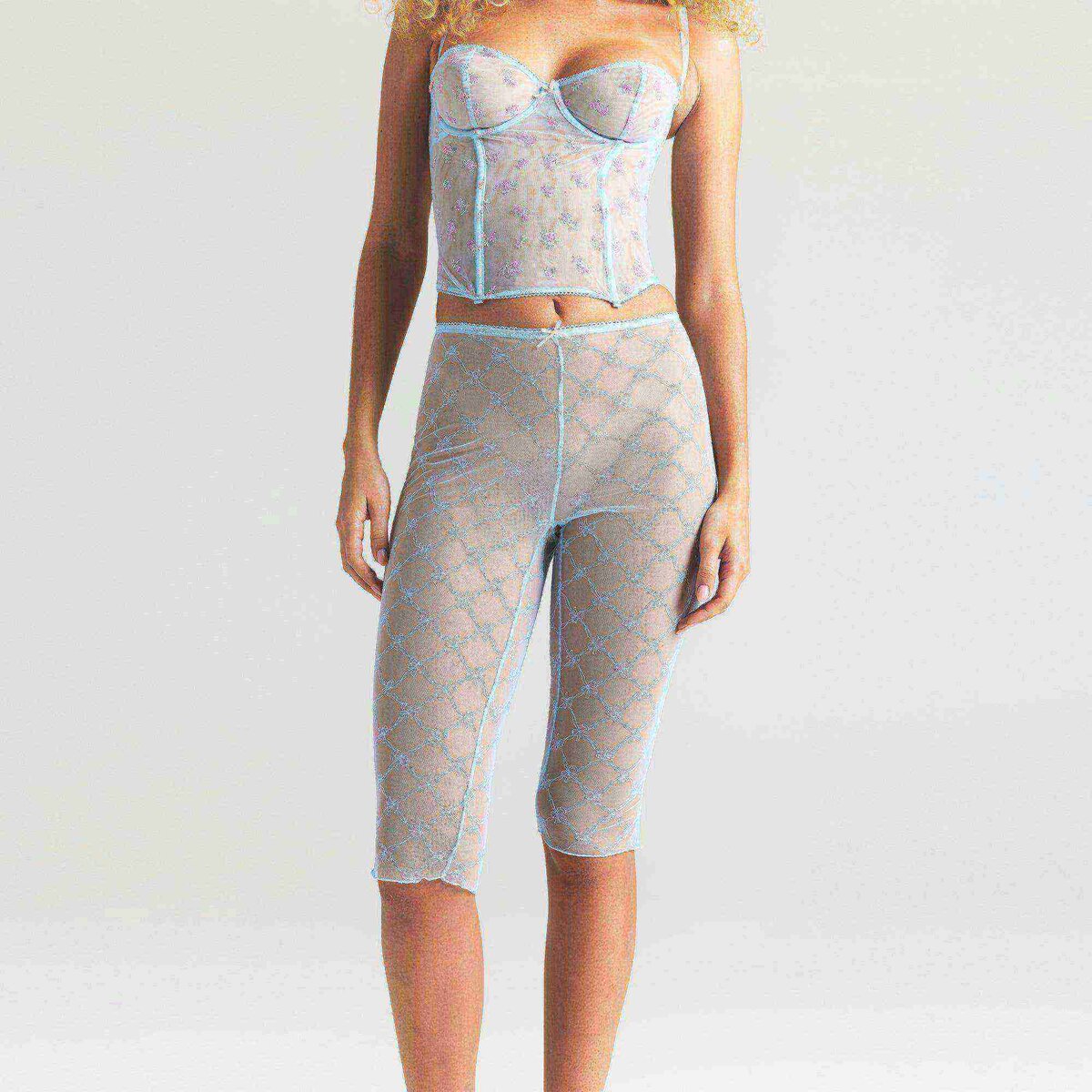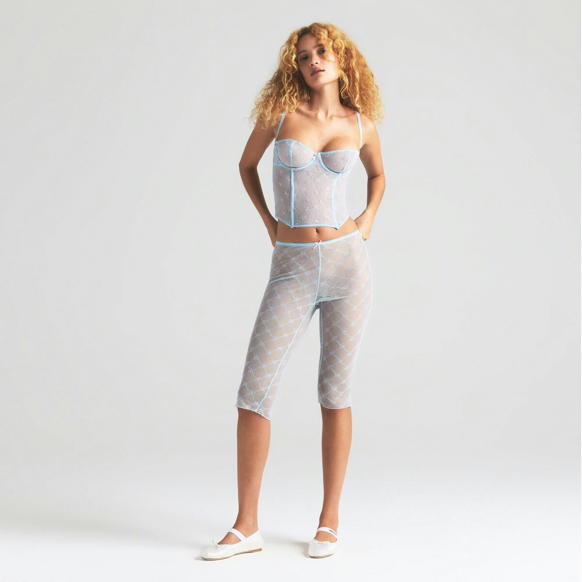 Sheer spring sexiness. Step out in confidence with this mid-rise cropped legging. Made with our embroidered bow tulle, this style features sweet picot trim, bow detailing, and sultry side slits at the hem. Recommended to size down.