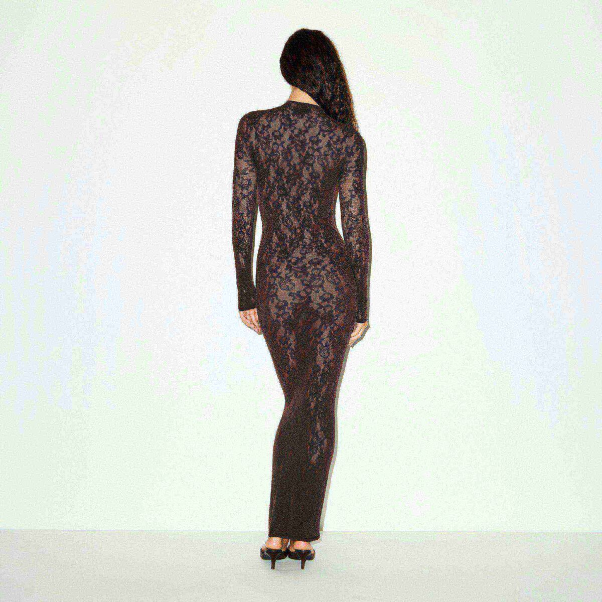 Make an entrance. Made with our sheer Knit Lace, this long sleeve dress features a mock neck and body-hugging fit for a striking look. Fits true to size.