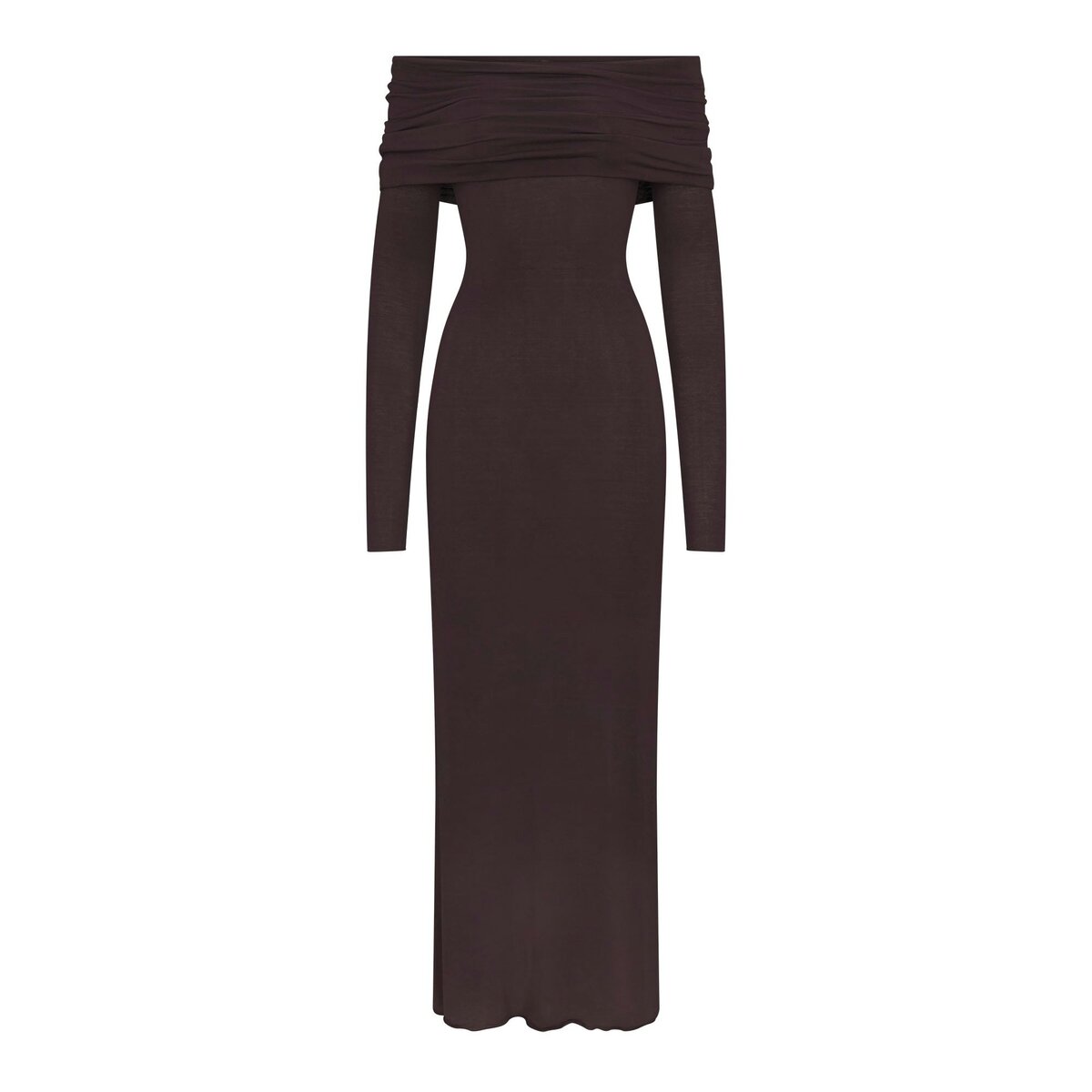 Dress to impress. Made from our soft and sheer modal-cashmere blend, this long dress features a foldover off-the-shoulder neckline and exaggerated long sleeves. Complete with a relaxed fit from hip to hem and fits true to size.