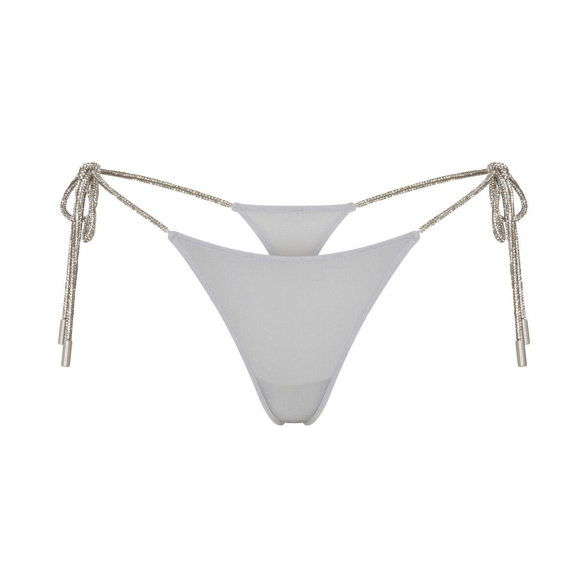 The shimmer your top drawer deserves. This sheer knit thong is designed with rhinestone cord ties at the hips for a flirty, adjustable fit. Complete with a 100% cotton gusset.