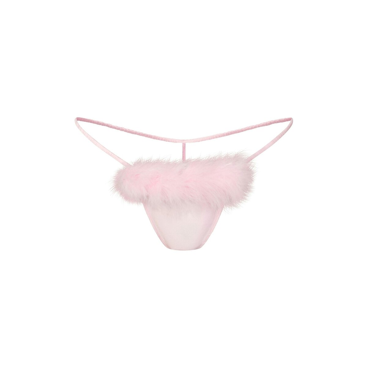 - Low rise, Elastic side straps, Removable feather trim, 100% cotton gusset, Thong back coverage