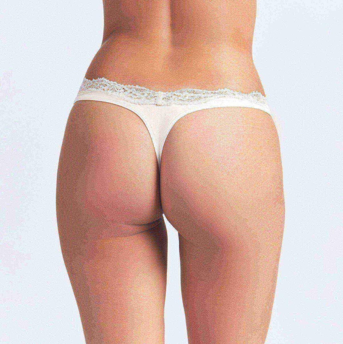 A dreamy update to your everyday thong. Features a dipped front, foil lace trim, and soft, stretchy Fits Everybody fabric that molds to your body.