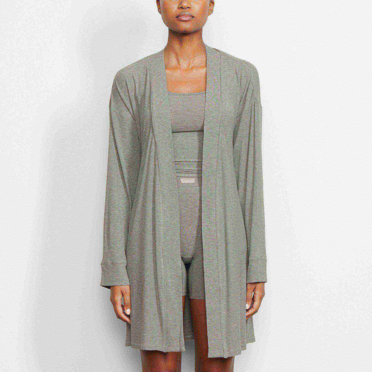 Wrap yourself in comfort with the SOFT LOUNGE ROBE in HEATHER GREY. A cozy robe for lounging. Shop now and complete your loungewear collection!