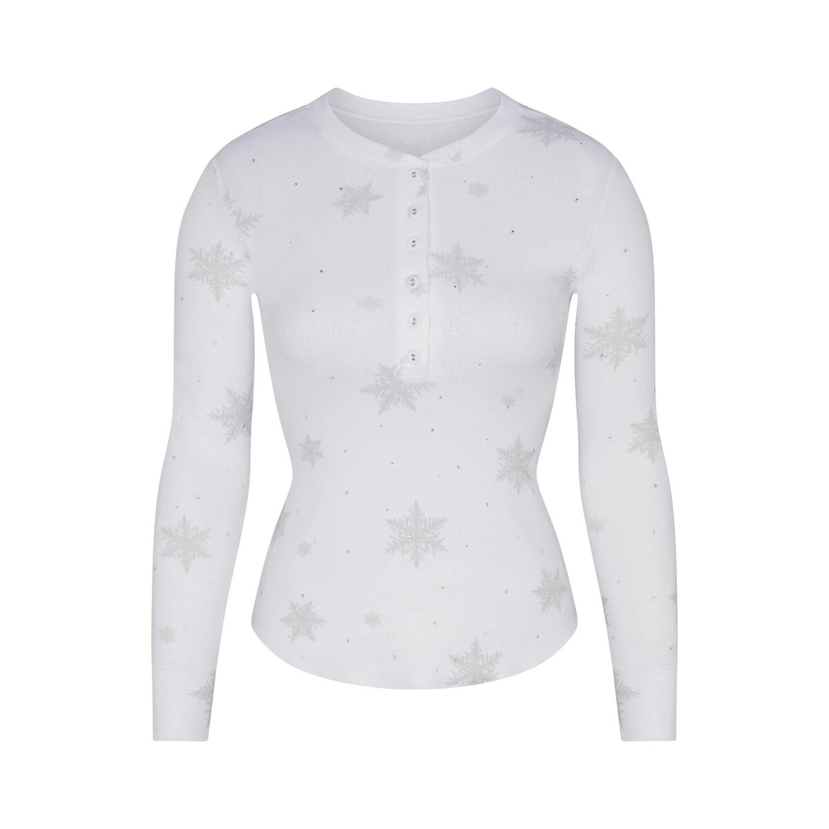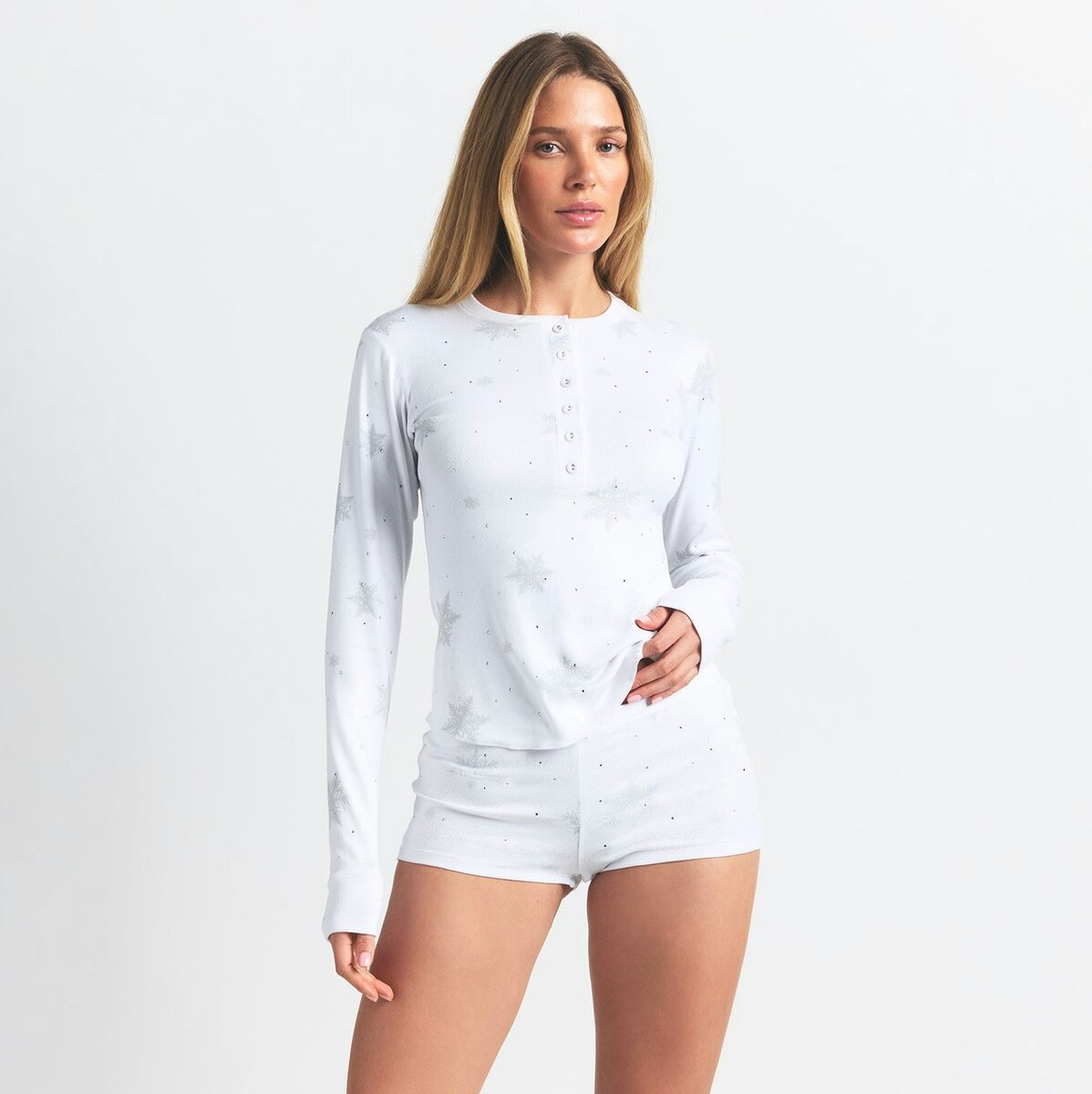 Cozy meets cute in this plush pointelle set. The top features a crew henley neckline, long sleeves, and a flattering curved hem for effortless style. The matching shorts sit low-rise with an encased elastic waistband, finished with a charming bow detail at center front—perfect for lounging in luxe comfort.