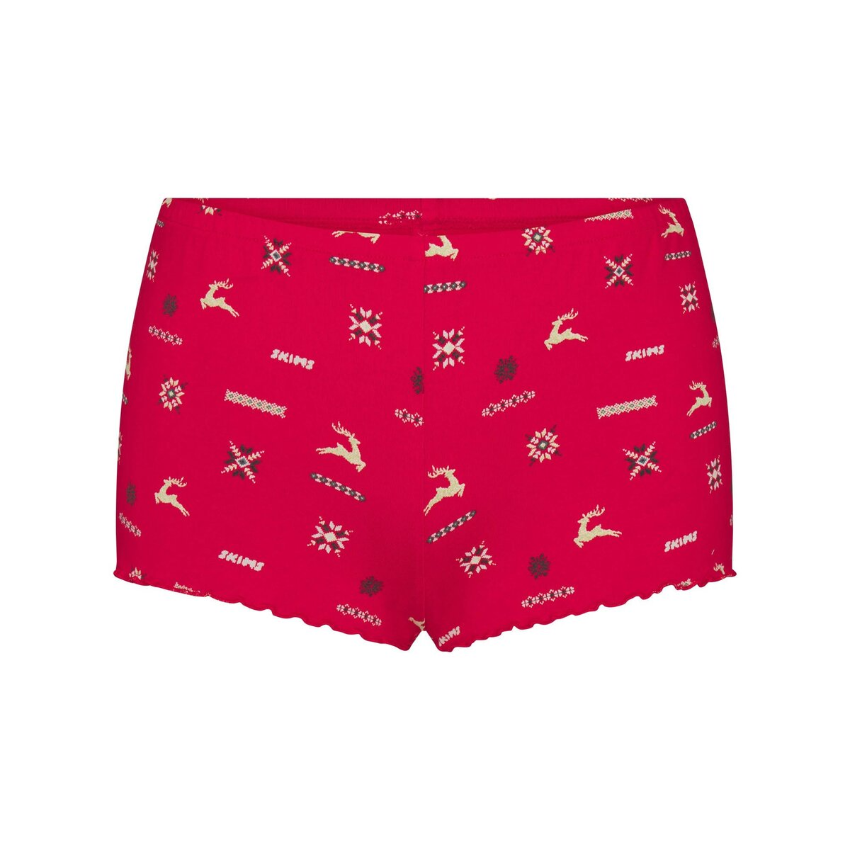 Feels like a dream. Designed with a triangle neckline and flirty ruching at the center front, this lipstick print set is adorned with frilly lettuce edge details at the cami and short hem. Includes an elastic underband and adjustable straps for support and comfort.