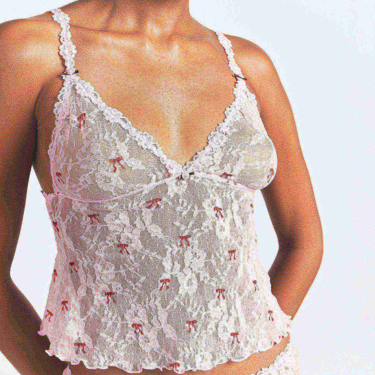 • Cami: Unlined triangle cup neckline, Lace trim detail along neckline and straps, Rosettes at center front and strap points, Thin, adjustable straps, Contrast stitch at hem, Short: Mid rise, Relaxed fit, Lace trim at waist, Rosette at center front waist