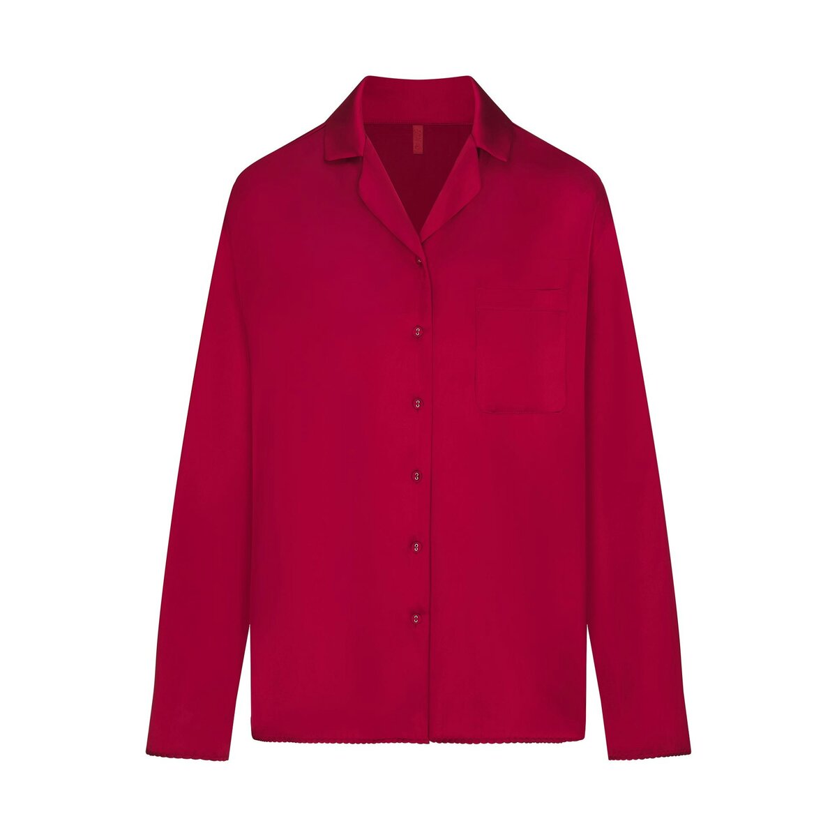 The secret to your most comfortable sleep. Made with our satiny Woven Shine fabric, this sexy two-piece set includes a long sleeve-button up with a ches…
