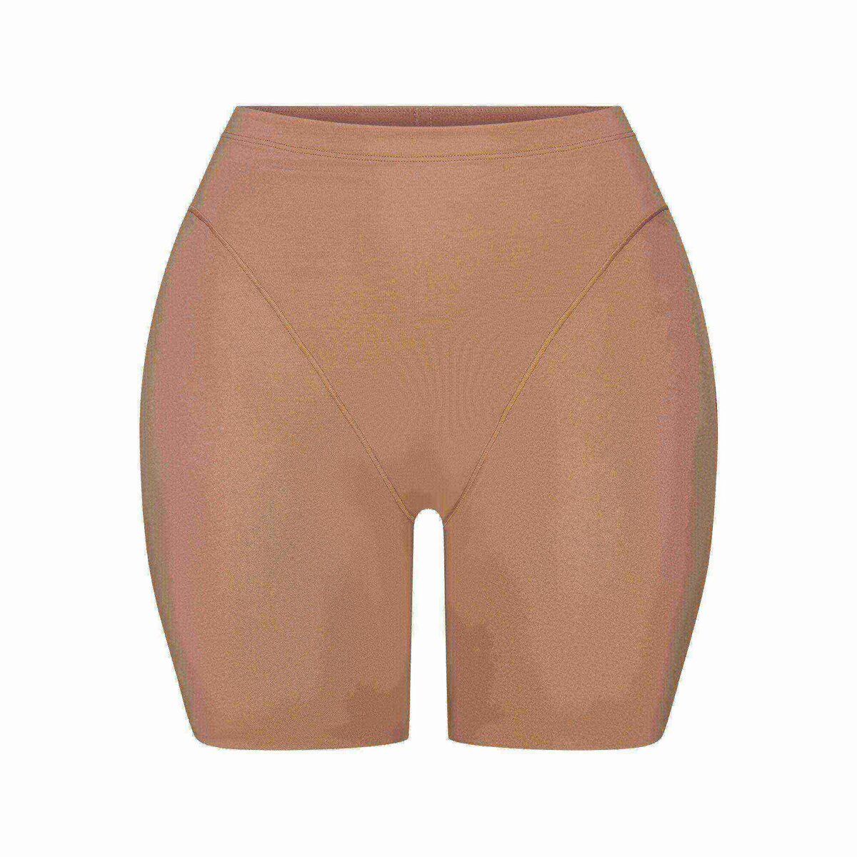 - Mid-rise, Embedded foam butt pads, Embedded foam hip pads, Closed gusset, Raw cut leg opening, Mid-thigh length