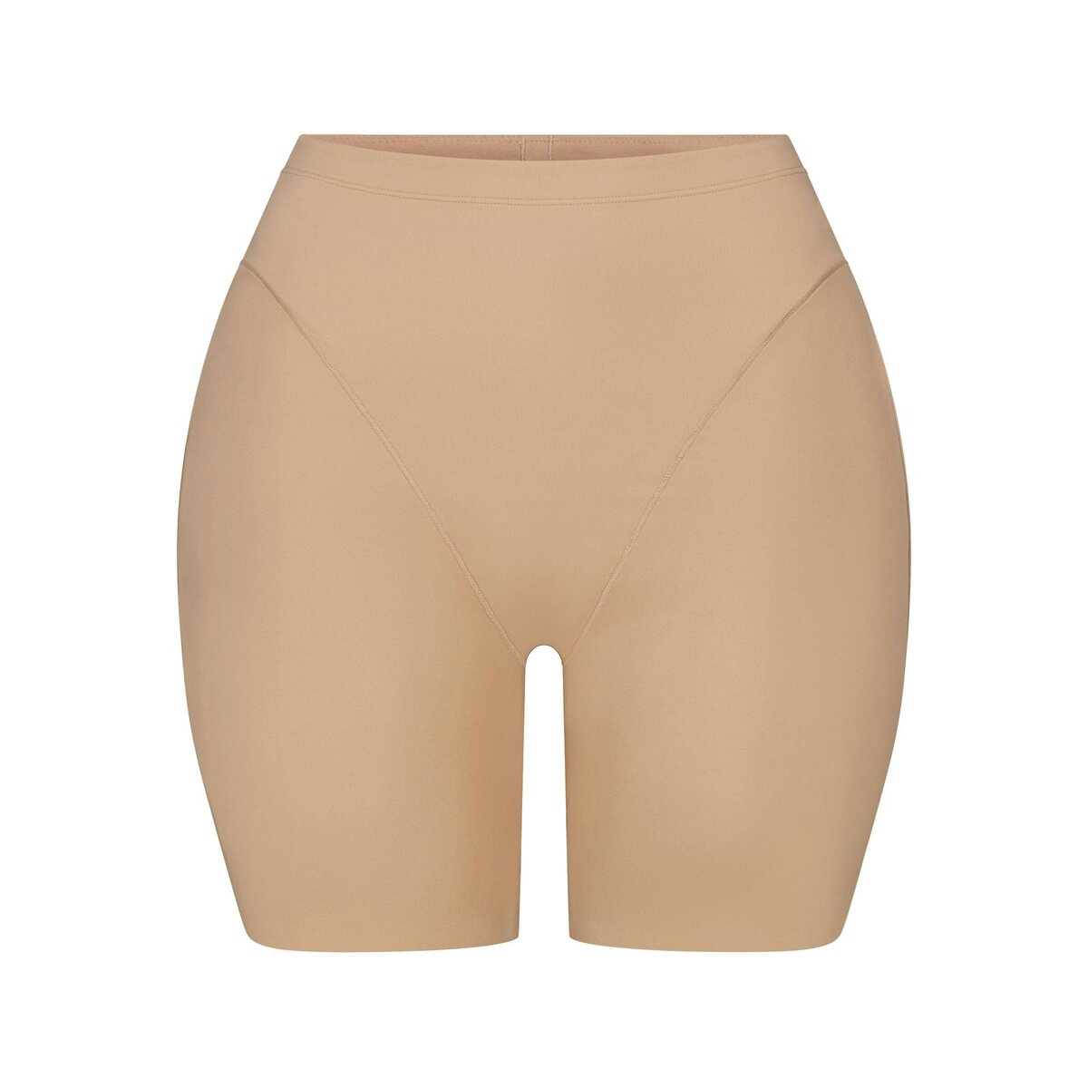 - Mid-rise, Embedded foam butt pads, Embedded foam hip pads, Closed gusset, Raw cut leg opening, Mid-thigh length
