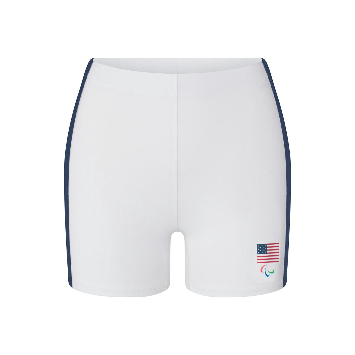 • Sits at mid-waist, Elastic encased waistband, Contrast color block panels, Mid thigh length, Team usa logo printed at center back, Official Paralympics logo printed at wearers left leg, Inseam 5”(size xxs-xl), 6”(size 2x-4x)
