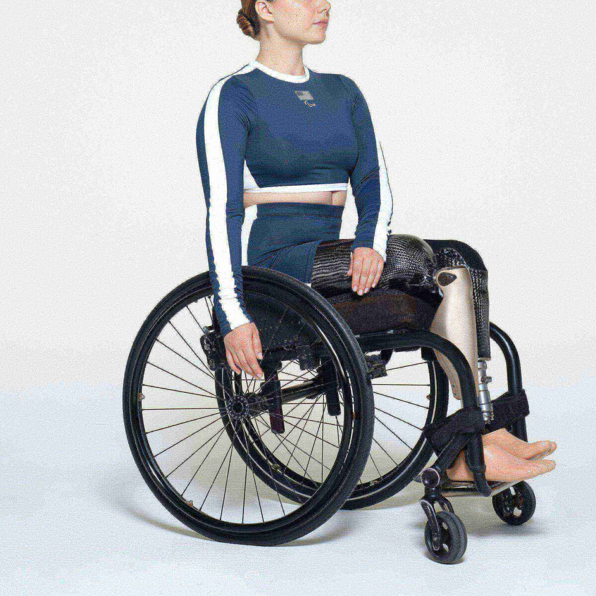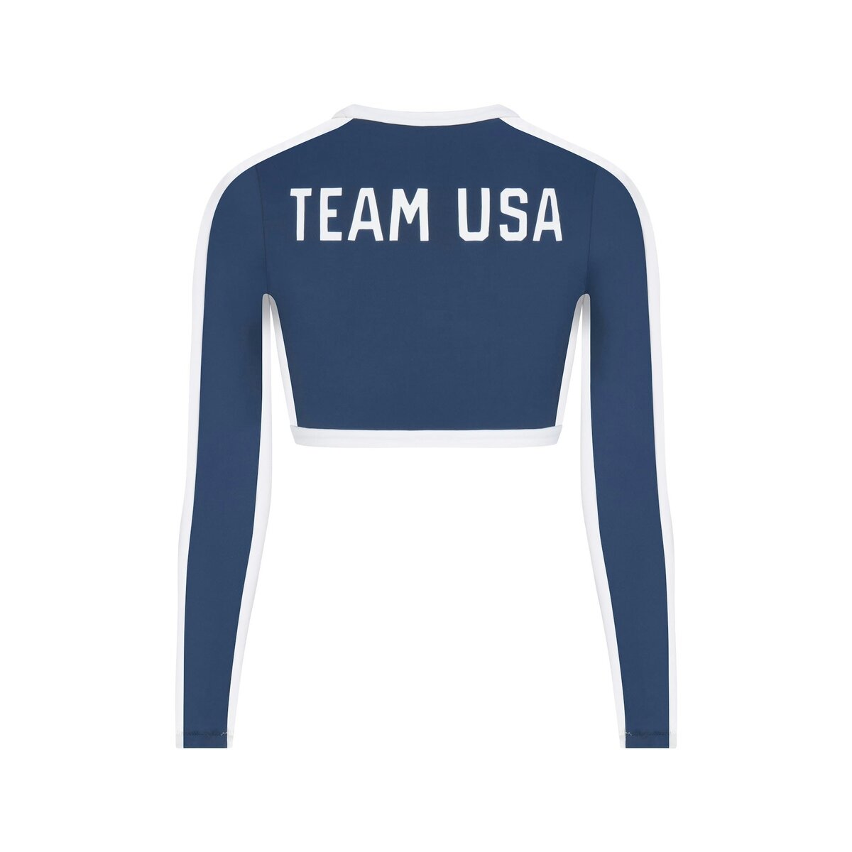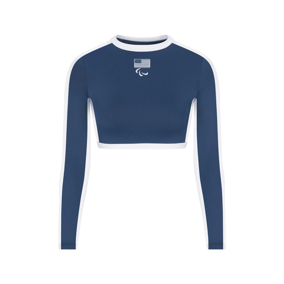A long sleeve swim top with color blocked sides and a classic crew neck. Features official graphics in support of the Team USA athletes participating in the Paralympic Games Paris 2024. Hits above the natural waist and fits true to size.
