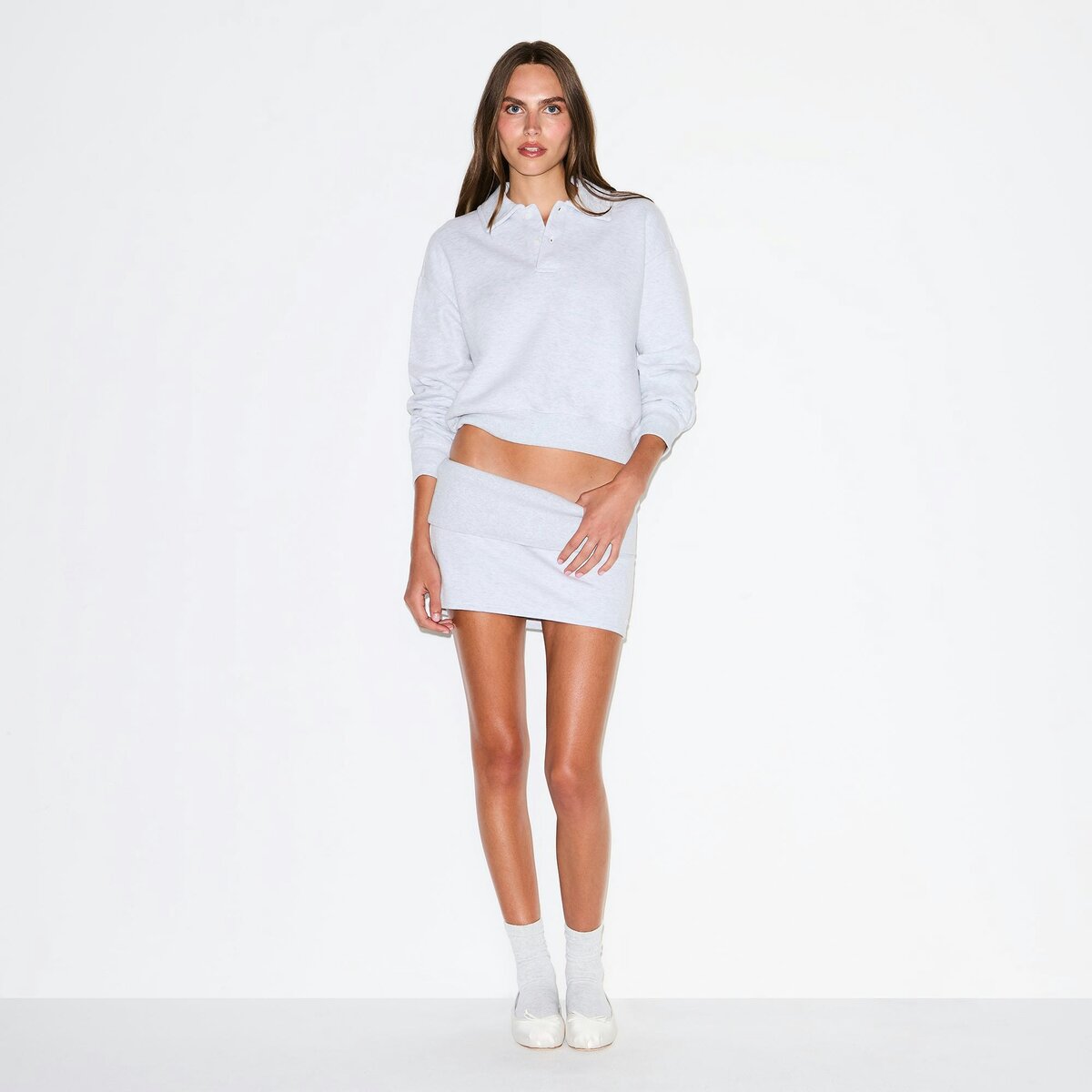 A+ in comfort. Add a preppy touch to your look with this long sleeve fleece polo, made in our signature cloud-like fabric. Features a center front button detail, ribbed cuffs and hem, and an embossed logo detail. Fits true to size.