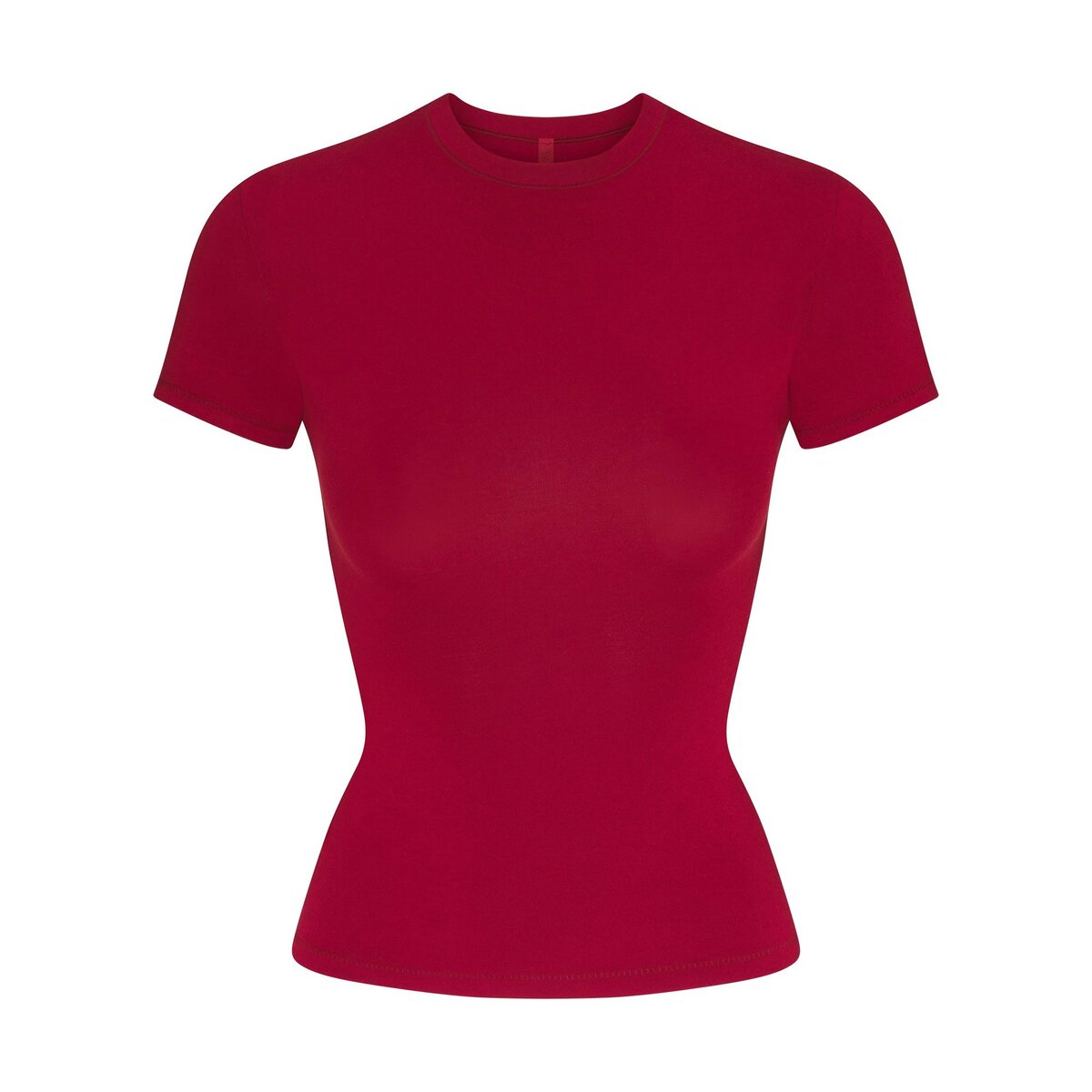 Our viral t-shirt in the cotton everyone craves. This perfect five-star tee is made with our stretchy, lightweight cotton that enhances your curves with its body-hugging fit and elevates your comfort with its incredibly soft feel. Features stitching details along the short sleeves and hem and hits below the natural waist. Fits true to size.