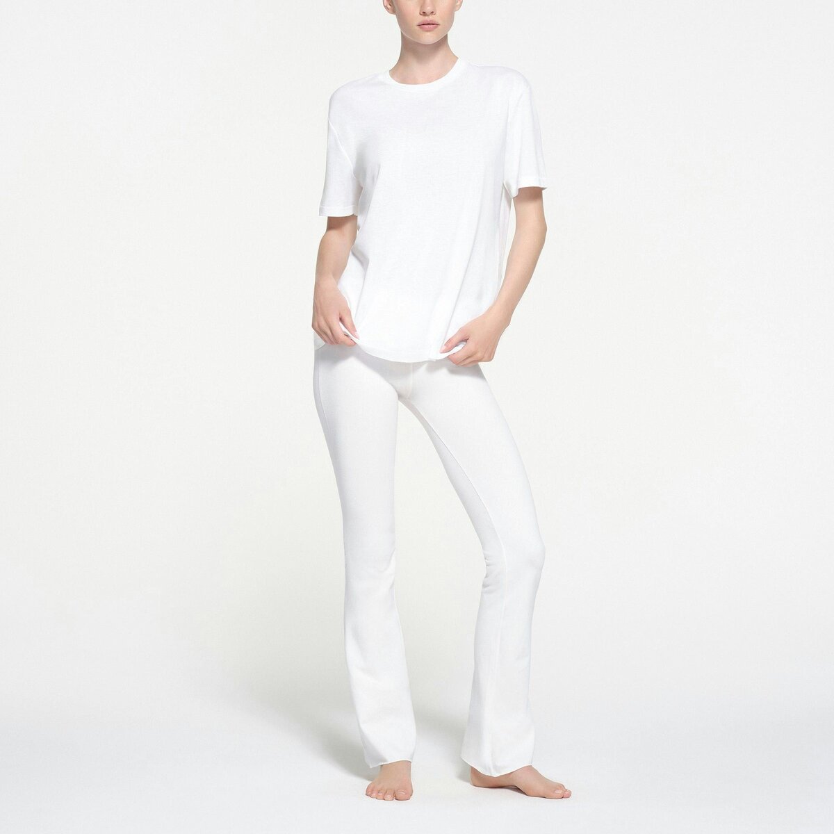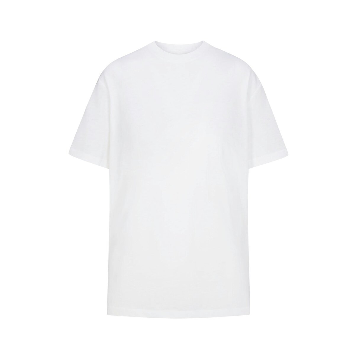 Just add jeans. This closet staple is comfortable for all-day wear with its soft, airy feel and perfectly oversized fit. Features short sleeves with a drop shoulder and a ribbed crew neck with a SKIMS logo label at the back. Hits at the hip with the option to tuck into bottoms. Fits true to size.