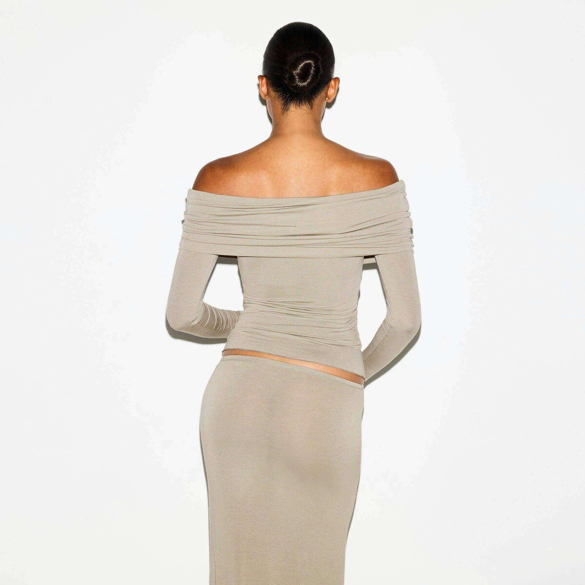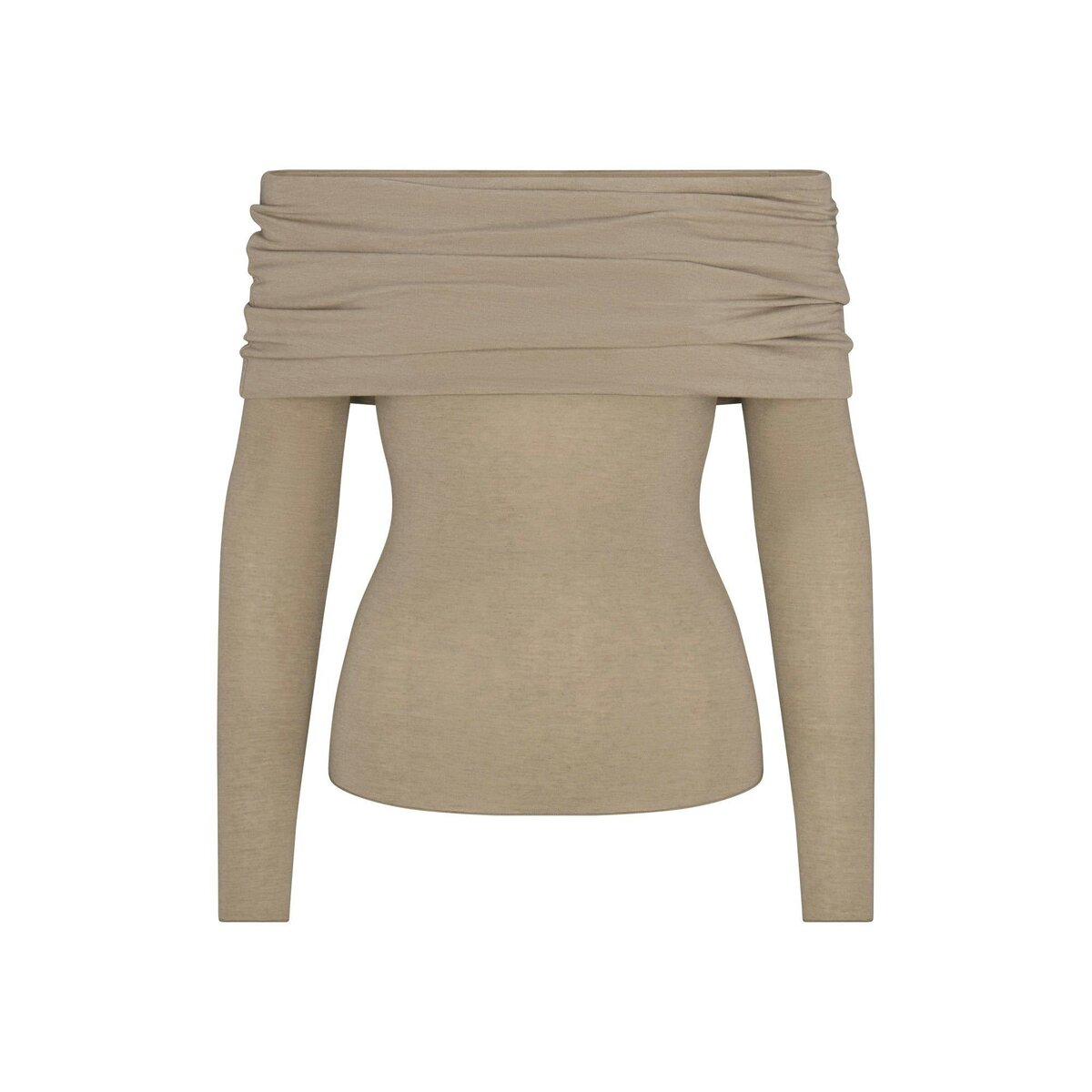Effortless allure meets elevated style. With a sheer look and body-hugging fit, this chic off-the-shoulder top is perfect for any occasion. Made from our soft and stretchy modal-cashmere fabric, this style features exaggerated long sleeves for an elevated finish. Fits true to size.