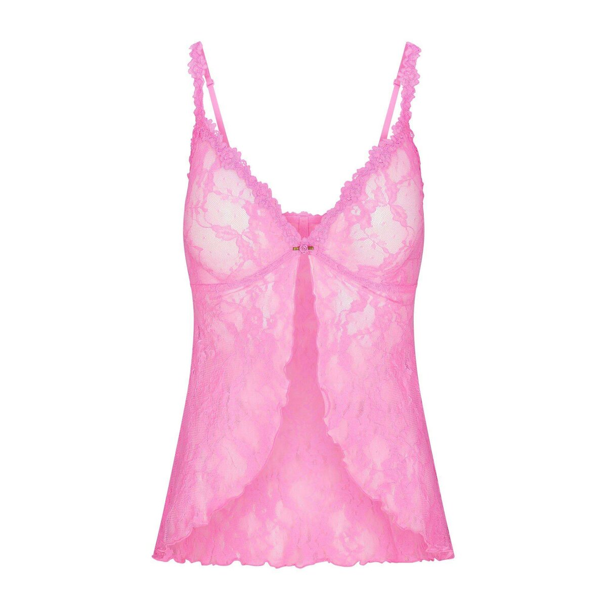 - Unlined molded cups, Contrast rosette at center front, Adjustable straps, Lace trim topped on at neckline, Underarm, Front strap and top wing, Elastic at underbust for additional support, Flyaway,Openfront, Lettuce edge hem, Designed in a sheer stretch lace