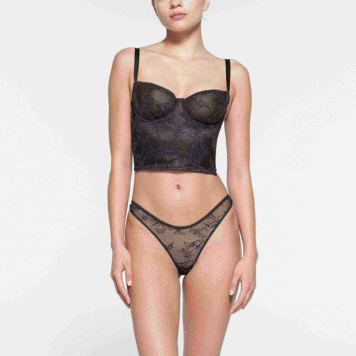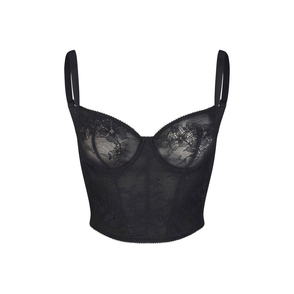 • Balconette neckline, unlined lace cups, underwire for support, adjustable straps, picot elastic at neckline, underarm, top wing and hem, steel boning at interior side seam, hook & eye closure at center back, designed in a sheer lace
